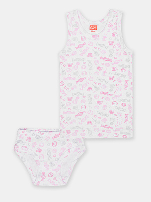 Комплект из гладкокрашенной майки и набивных трусов. Майка с плечом. Горловина и проймы обработаны окантовкой из основного полотна. Перед оформлен шелкографией. Верх трусов обработан плоским швом вподгибку с одновременным прокладыванием резинки. Проймы ножек обработаны окантовкой из основного полотна.